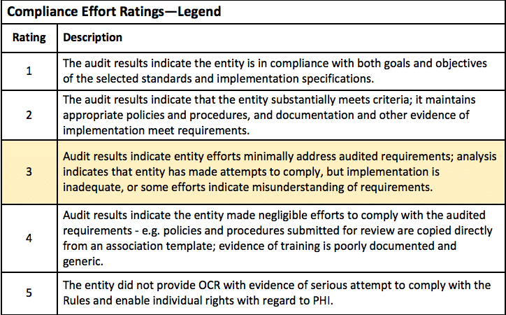 The feedback this organization received was far from ideal. The auditor assessed entity efforts to comply with the selected elements using the following guidelines. Their score of 3 (highlighted below) out of 5 suggests room for improvement, saying that they “made attempts to comply, but the implementation is inadequate, or some efforts indicate a misunderstanding of requirements.”