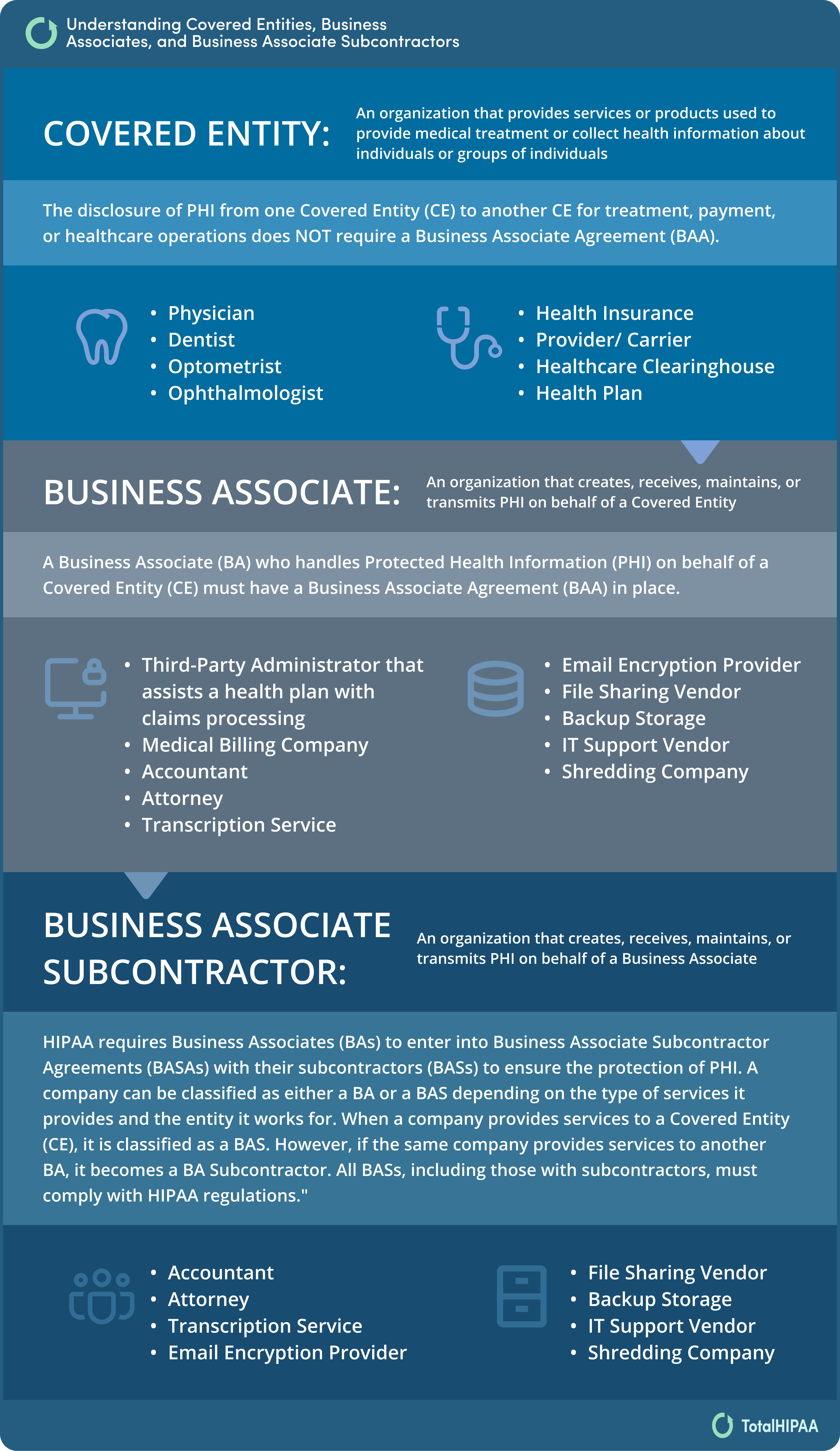 A BA can also use a subcontractor (BAS) to perform some of its services. A BAA is required between the BA and the BAS if a BAS accesses PHI. It is important to ask your BAs if they have contractors they use on your behalf and if a BAA is in place. Remember, under the Common Agency Provision, your BAs issues become yours.