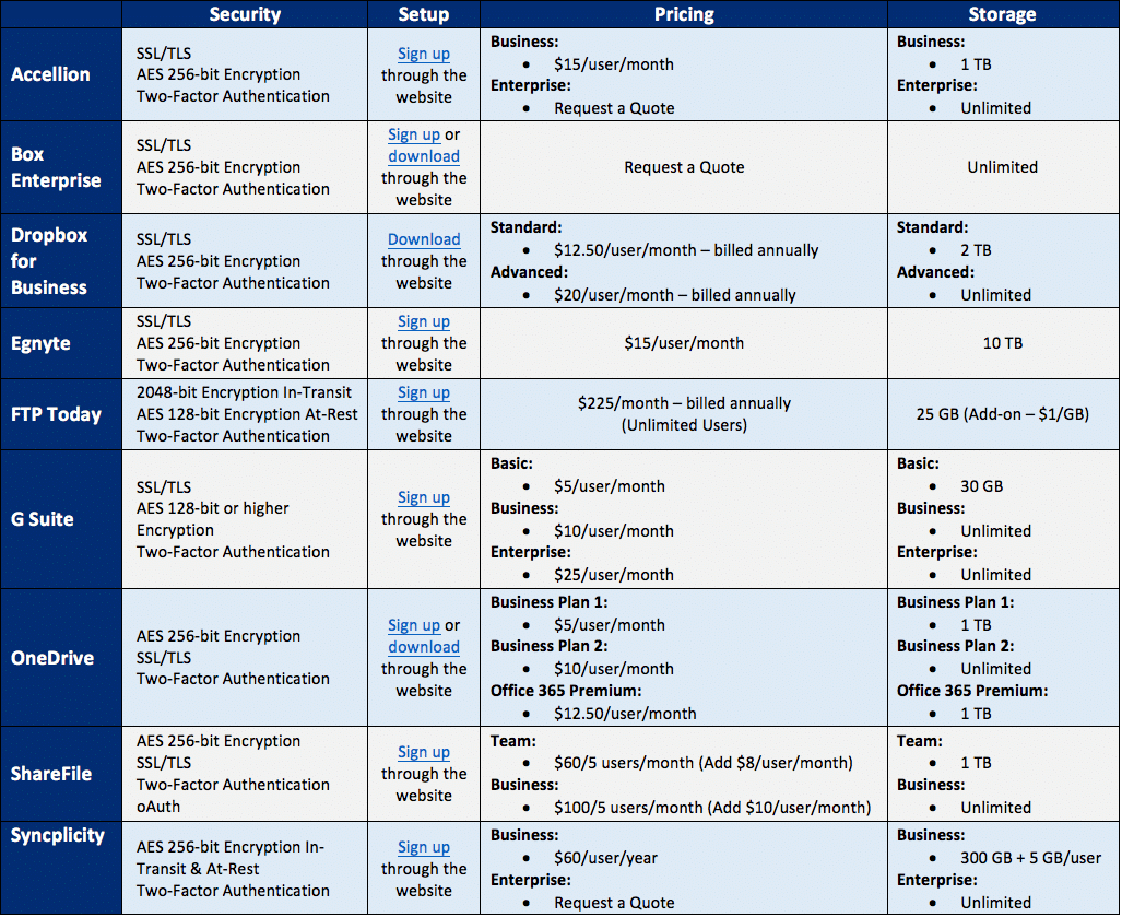 With the Compliant Enterprise package, your organization will receive an unlimited amount of users, unlimited file size, and starts at 25 GB of storage space with the option to add more. For $1.00/GB your add more storage to your subscription. There is also a 30-day free trial and